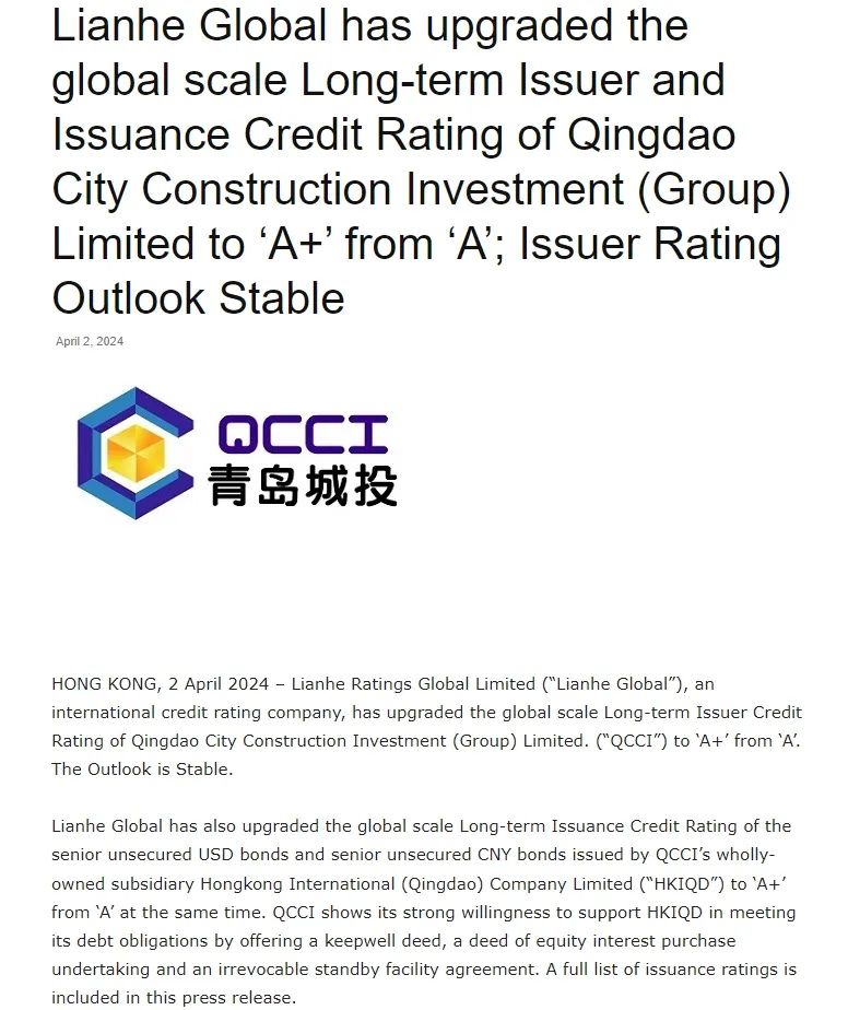 4月2日,权威评级机构联合国际正式宣布上调开云(中国)国际长期发行人评级从‘A’上调至‘A+’,展望稳定,同时将由青岛城投全资子公司香港国际(青岛)有限公司(“香港国际”)发行的高级无抵押美元债券和高级无抵押人民币债券的国际长期发行债务评级从‘A’上调至‘A+’。