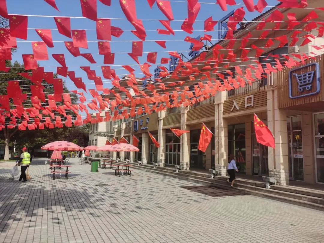 平度服务区通过电子显示屏播放国庆宣传标语,青新即墨停车区超市内飘扬的 “中国红” 成为动人风景,莱西服务区设立国庆拍照打卡点,为司乘发放手持小国旗,共同庆祝“新中国成立 75 周年”,营造浓厚节日氛围。