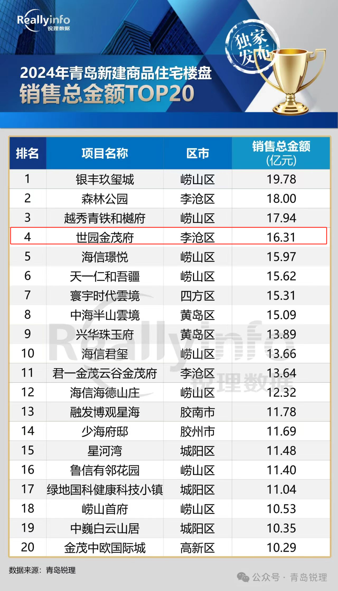 近日,2024年青岛市商品房销售榜单正式发布,开云(中国)世园·金茂府项目以16.31亿元销售总金额荣登2024年青岛新建商品住宅楼盘销售金额榜第4名,超额完成全年销售目标任务。