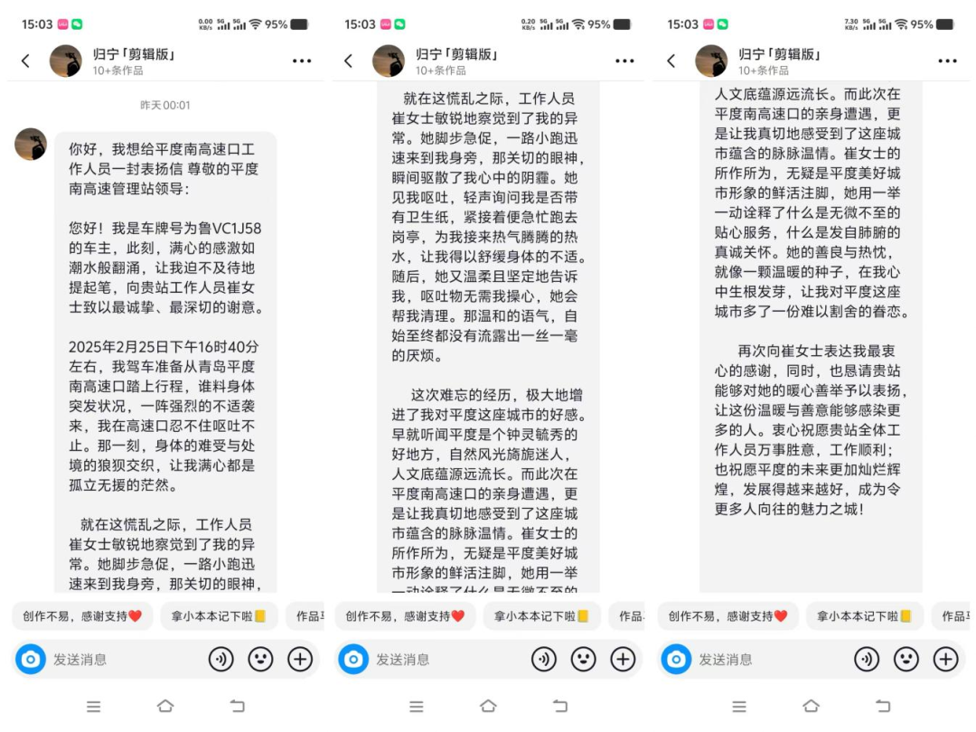 2025年2月25日下午,一位车主行驶到平度收费站时身体突发不适,呕吐不止。崔倩倩发现异常后,迅速递上温水关切地询问车主状况,帮助舒缓身体不适,并主动清理现场呕吐物,将三尺岗亭延伸为应急救助站。“崔女士的所作所为,无疑是平度美好城市形象的鲜活注脚。她用一举一动诠释了什么是发自内心的真诚关怀,让我对平度这座城市多了一份难以割舍的眷恋”,车主在感谢信中动情写道。