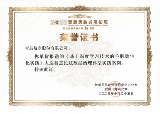 近日,2023年智慧民航发展论坛在北京举办,青岛城投旗下青岛航空获得民航局颁发的“智慧民航典型案例”荣誉证书,成为此次评选航空运输单位入选的10个案例之一。这是继2022年度民航数据共享数字化能力指数(DCI)排名第一后,青岛航空的信息化建设工作再次获得我国民航业权威奖项 。