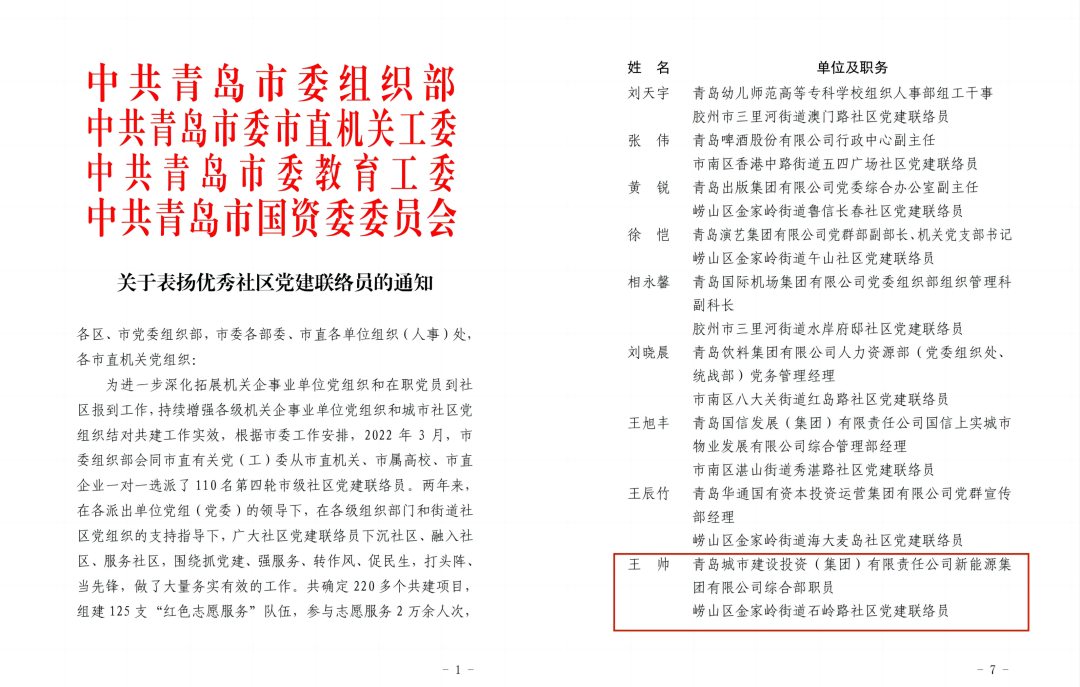 近日,市委组织部、市直机关工委、市委教育工委、市国资委四部门联合行文《开云网页版登录入口表扬优秀社区党建联络员的通知》对青岛城投新能源集团王帅同志等55名优秀社区党建联络员进行了表彰。2022年以来,城投集团与金家岭街道石岭路社区开展党建结对共建“双报到”,本次表彰再次体现了有关部门对集团党建共建工作的高度评价。